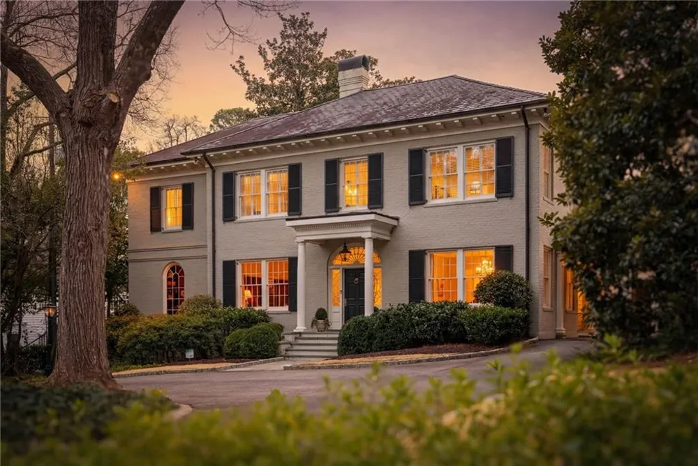 This classic 1920s brick Georgian in the heart of Peachtree Heights blends timeless architecture with modern livability. High ceilings, deep moldings, expansive windows, and dark hardwood floors set a refined tone throughout. A paneled office and den with fireplace complement the formal living and dining rooms, while an additional private room offers flexibility for a second office or study. The updated kitchen features high-end appliances and a bay-windowed breakfast room that opens to the spacious family room with built-ins, wood-burning fireplace, and French doors to the deck. Two powder rooms, a built-in family office, and custom lockers enhance everyday convenience. The side deck wraps around to a bluestone patio which overlooks a large saltwater pool surrounded by lush landscaping and fountain, all beautifully sited on nearly three-quarters of an acre. Upstairs are two en-suite bedrooms plus a guest room with hall bath, a laundry room and large linen closet. The gracious primary suite includes built-in bookshelves, a gas log fireplace, plus dual bathrooms and custom finished closets. The finished basement includes a full bath and functions as a playroom, gym, or wine cellar. A separate guest house (not included in the bedroom count) offers a kitchen with room for breakfast table, a living room, a bedroom with two closets, and full bath. The two-car garage is below the guest house with room for guest parking plus a flat play yard. The beautifully landscaped lot includes irrigation system and plenty of landscape lighting. Additional features include a generator, permanent stairs to the attic with a cedar closet, a 220-volt electric car charger outlet in the garage.