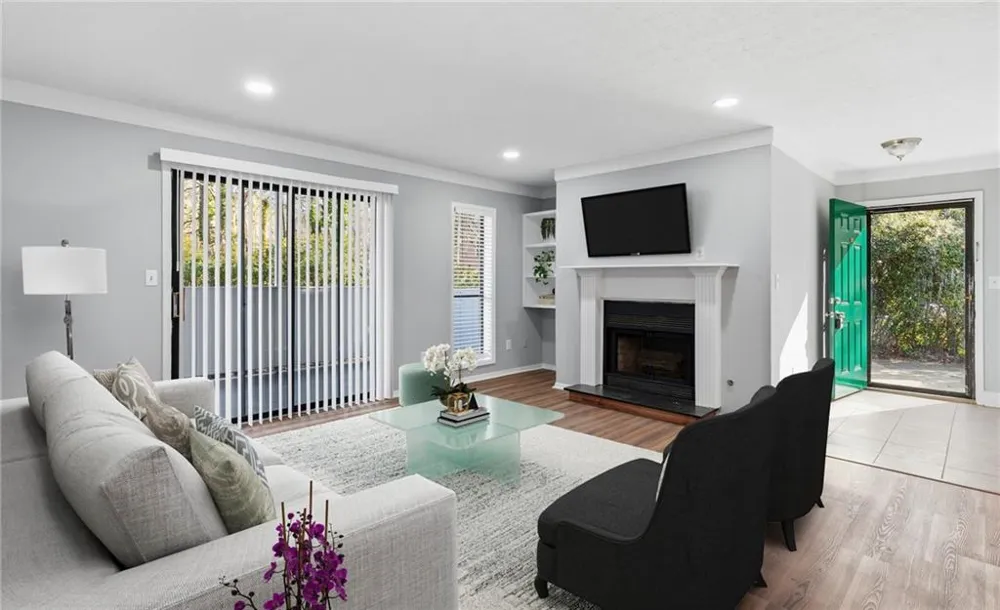 Beaming with natural sunlight and fully renovated with exceptional attention to detail, this private 2-bedroom, 1-bath residence offers a rare blend of modern sophistication, comfort, and convenience—complete with an extra-large balcony that enhances the home’s open, airy feel and adds an impressive extension of living space. At the heart of the home is the completely brand-new kitchen, beautifully reimagined with all-new cabinetry, luxurious quartz countertops, a designer backsplash, double sinks, a pantry, and a bright window that floods the space with light. Every detail has been updated, including all-new stainless steel appliances, creating a kitchen that feels elevated, fresh, and move-in ready. The spacious open-concept living area is anchored by built-in bookshelves and a cozy fireplace, offering timeless charm alongside modern updates. Sliding glass doors lead directly to the oversized balcony, creating effortless flow and an ideal setting for entertaining or everyday enjoyment. A separate dining area provides flexibility and can easily function as a dedicated home office, lounge, or formal dining space. Both bedrooms are generously sized and feature walk-in closets, along with brand-new plush carpeting for added comfort. The fully updated bathroom delivers a clean, modern aesthetic with a tub/shower combination, new vanity, new tile flooring, and all-new fixtures. Additional improvements include fresh interior paint, along with new lighting and plumbing fixtures throughout, reinforcing the home’s true turnkey appeal. Enjoy ample parking in the expansive lot with spaces located just steps from the unit, plus resort-style community amenities including a salt-water swimming pool, tennis courts, and professionally maintained grounds. Ideally positioned near The Battery & Truist Park, I-75 access and GA-400, and Downtown Atlanta, with everyday conveniences close by. Monthly HOA includes Water, Hazard Insurance, Flood Insurance, Termite Control, Trash Pickup, Exterior & Yard Maintenance—offering exceptional value and low-maintenance living. FHA-approved community. This is a true diamond—sunlit, stylish, and fully move-in ready—perfect for first-time buyers, downsizers, or investors seeking a beautifully upgraded home in one of Cobb’s most desirable locations.